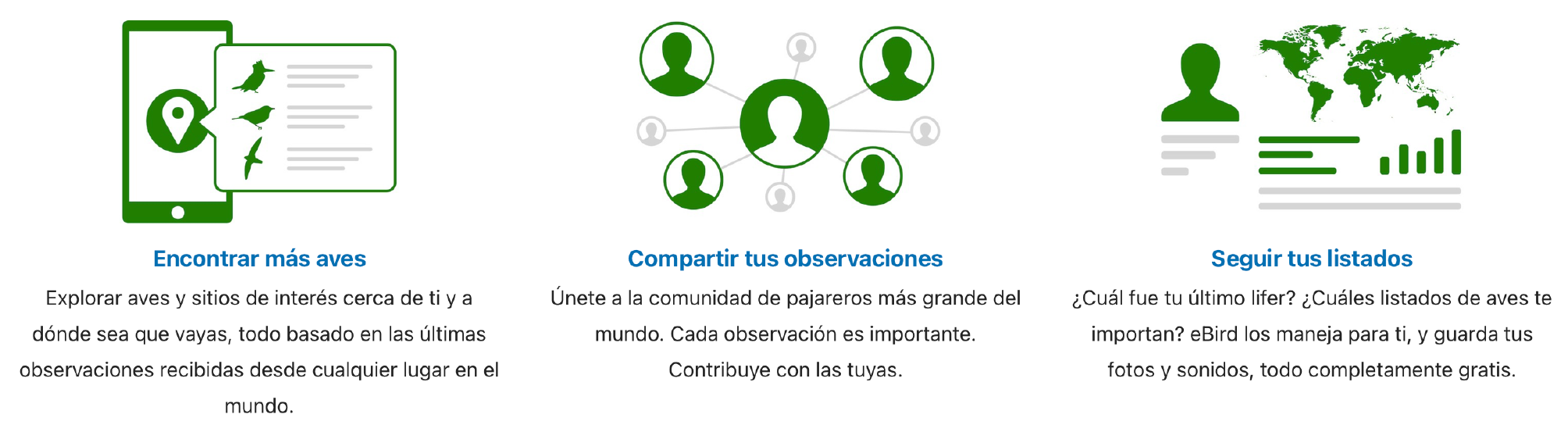 Los datos de eBird documentan la distribución, abundancia, uso del hábitat y tendencias de las aves a través de listas de verificación recopiladas dentro de un marco científico simple. Los observadores de aves ingresan cuándo, dónde y cómo observaron aves, y luego completan una lista de verificación de todas las aves vistas y escuchadas durante la excursión. La aplicación móvil gratuita de eBird permite la recopilación de datos sin conexión en cualquier parte del mundo, y el sitio web ofrece muchas formas de explorar y resumir sus datos y otras observaciones de la comunidad global de eBird.